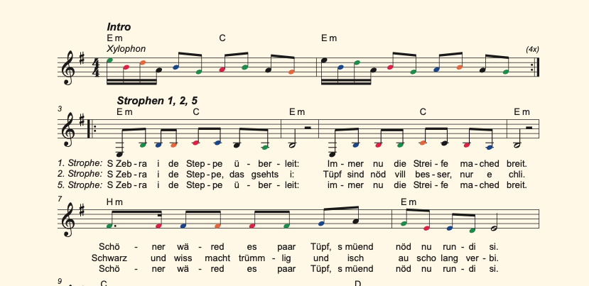 Im Stil eines einfachen Songbooks gehalten: Texte und Akkorde der 15 Lieder, darunter „De Esel“, „Du und ich“, „Rägeboge“, „Orangerote Drache“ und „Chline Has“, als PDF-Datei. Illustrationen: Ingrid Sissung.